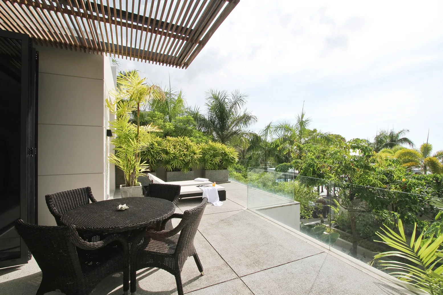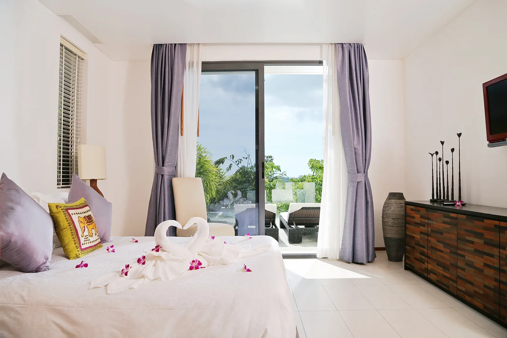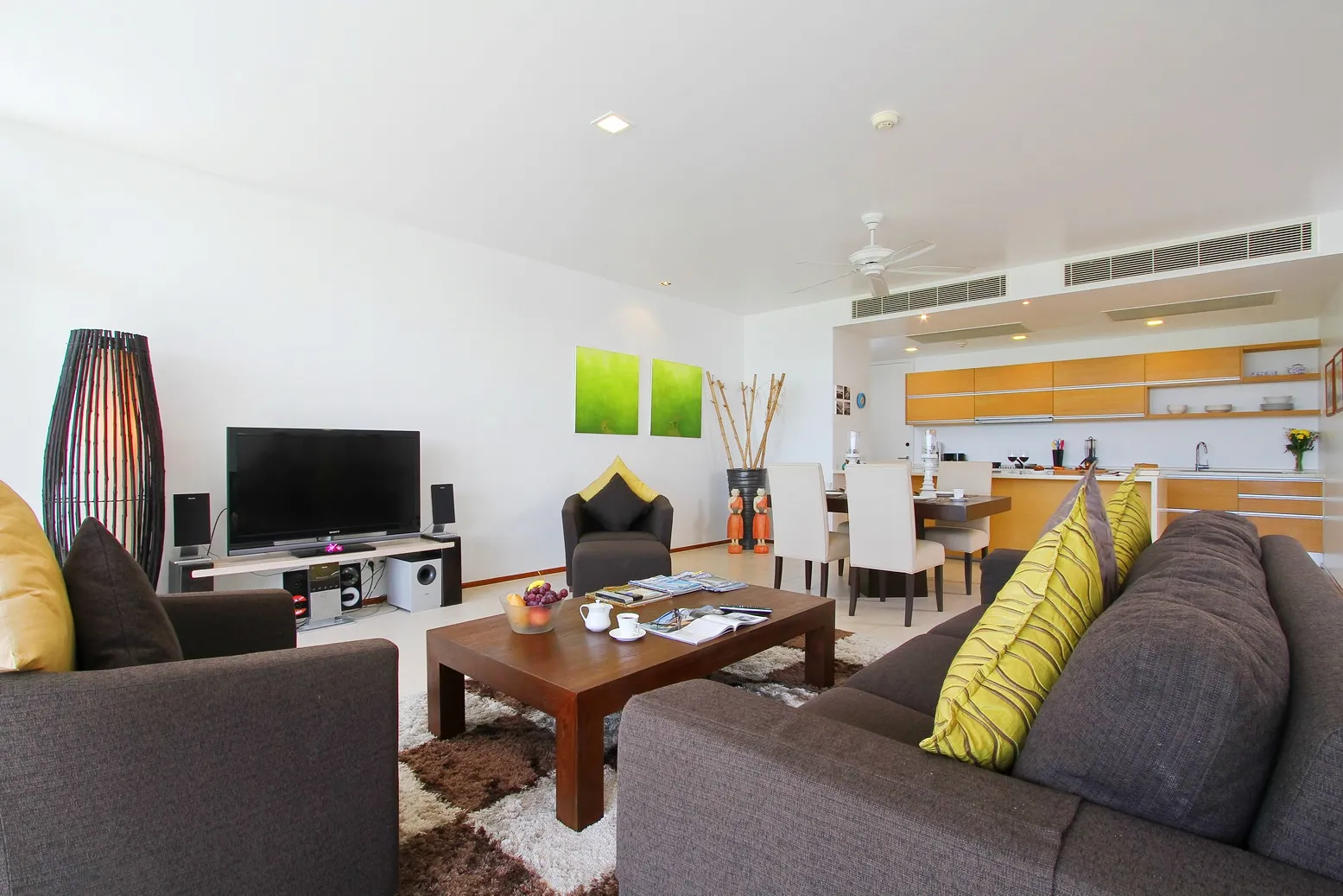 This Fully Furnished Two Bedroom - Two Bathroom Condo in an award winning residential development. The 190 sq metre living area includes a large Terrace with Kata sea/mountains and pool view. The unit is tastefully decorated in a modern Contemporary style, and includes fully equipped kitchen. This unit has a BBQ grill. The open plan living area, features modern designed sofa, and large slim Home Cinema including Dvd Player, music system and True vision Satellite Package. Each bedroom also have the TV. There is also wireless Broadband, which is accessible from all areas of the Condo. The main terrace features include a 4 seater dinning table and there are also 2 sun loungers.