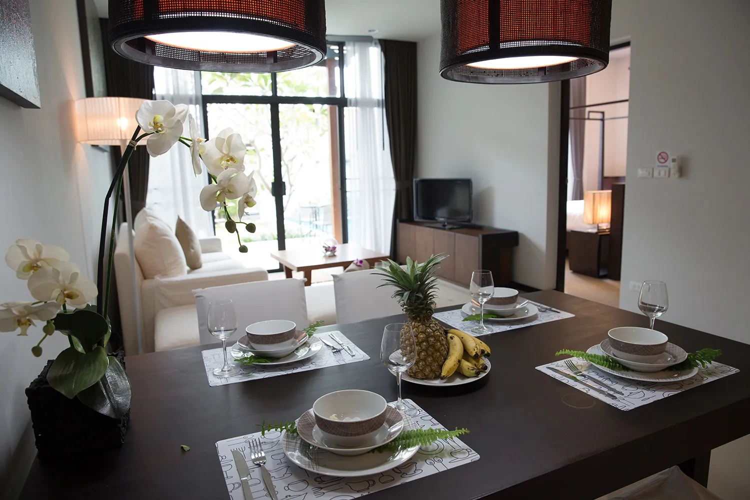 - Living area with sofas and pop-up LCD TV