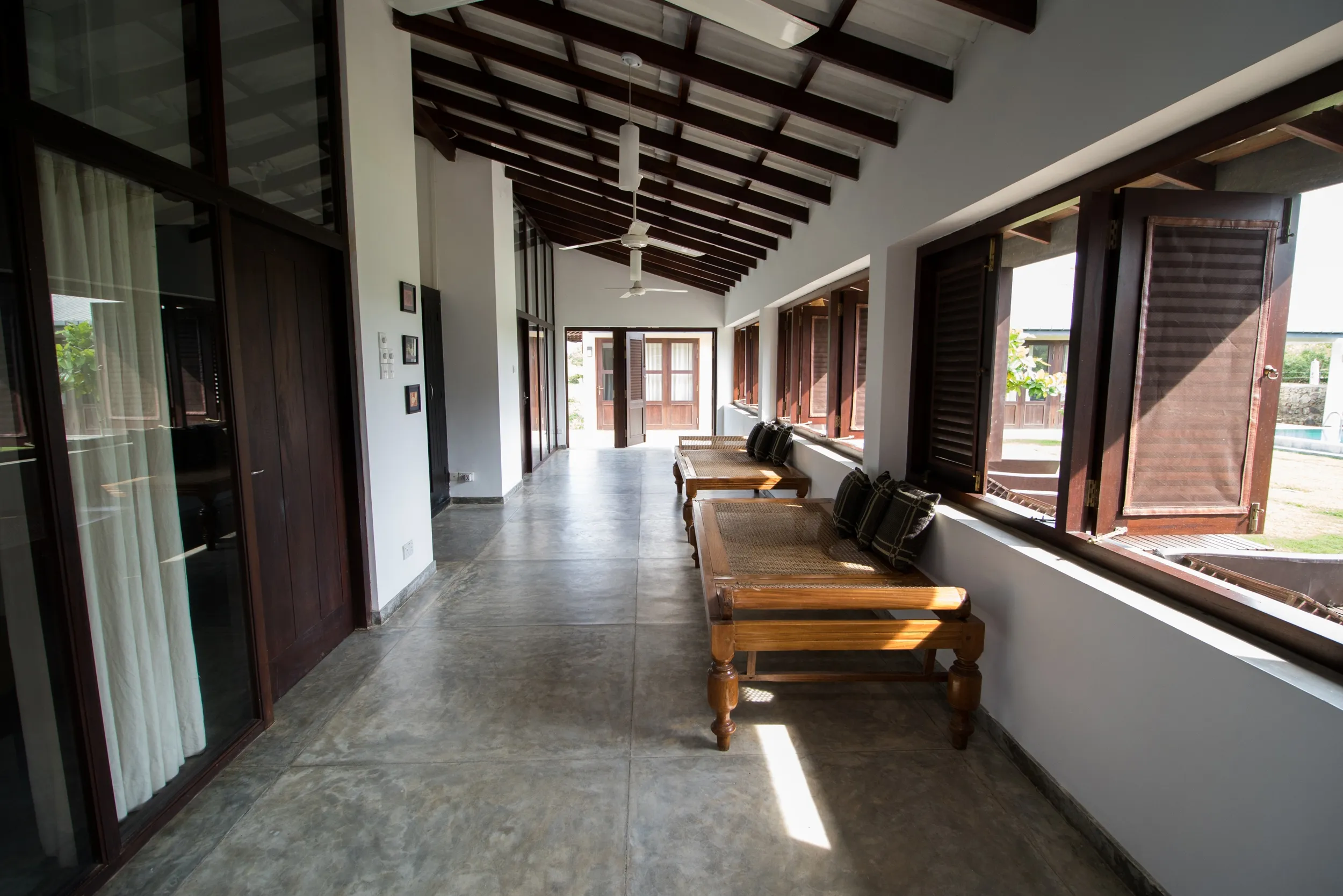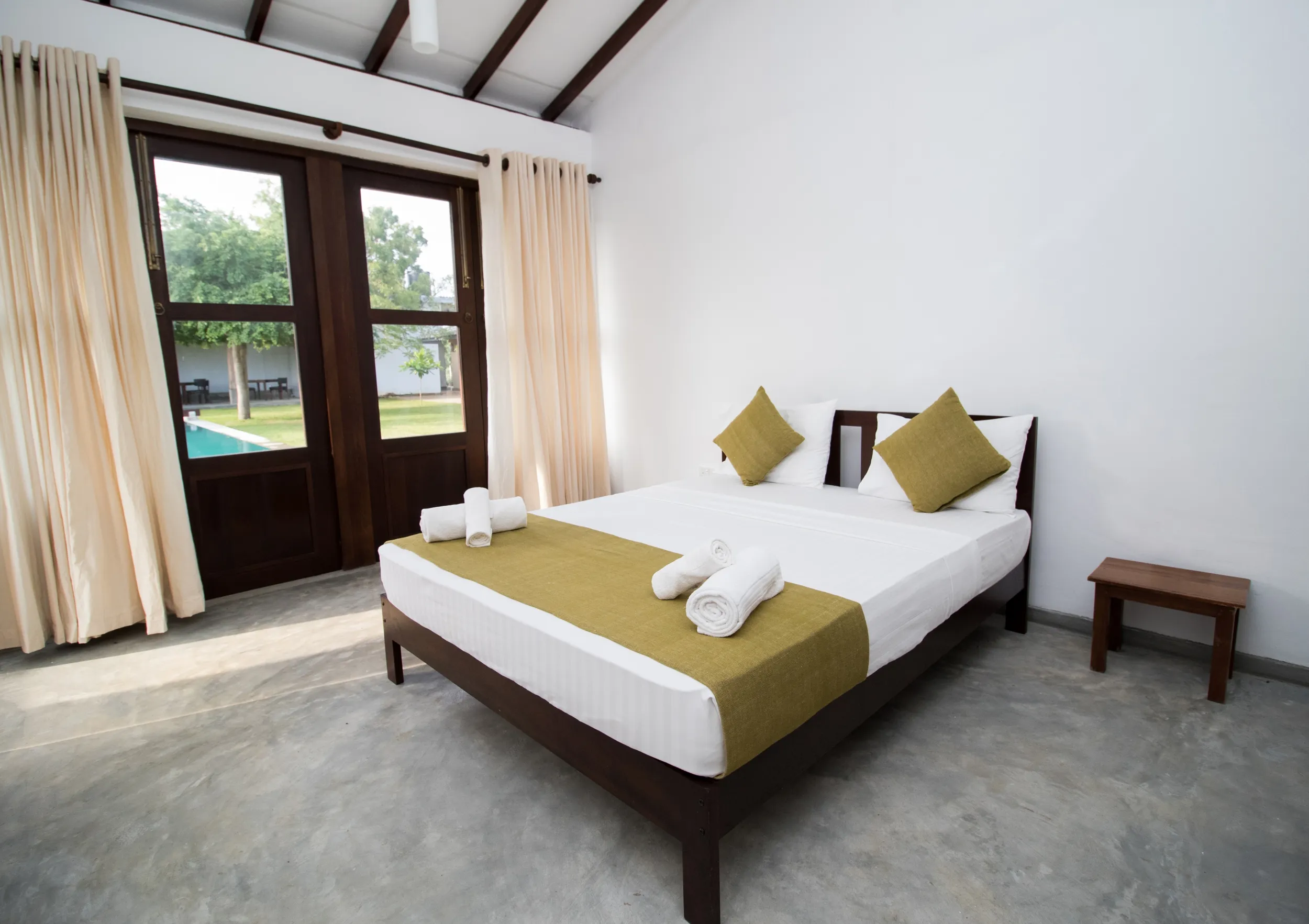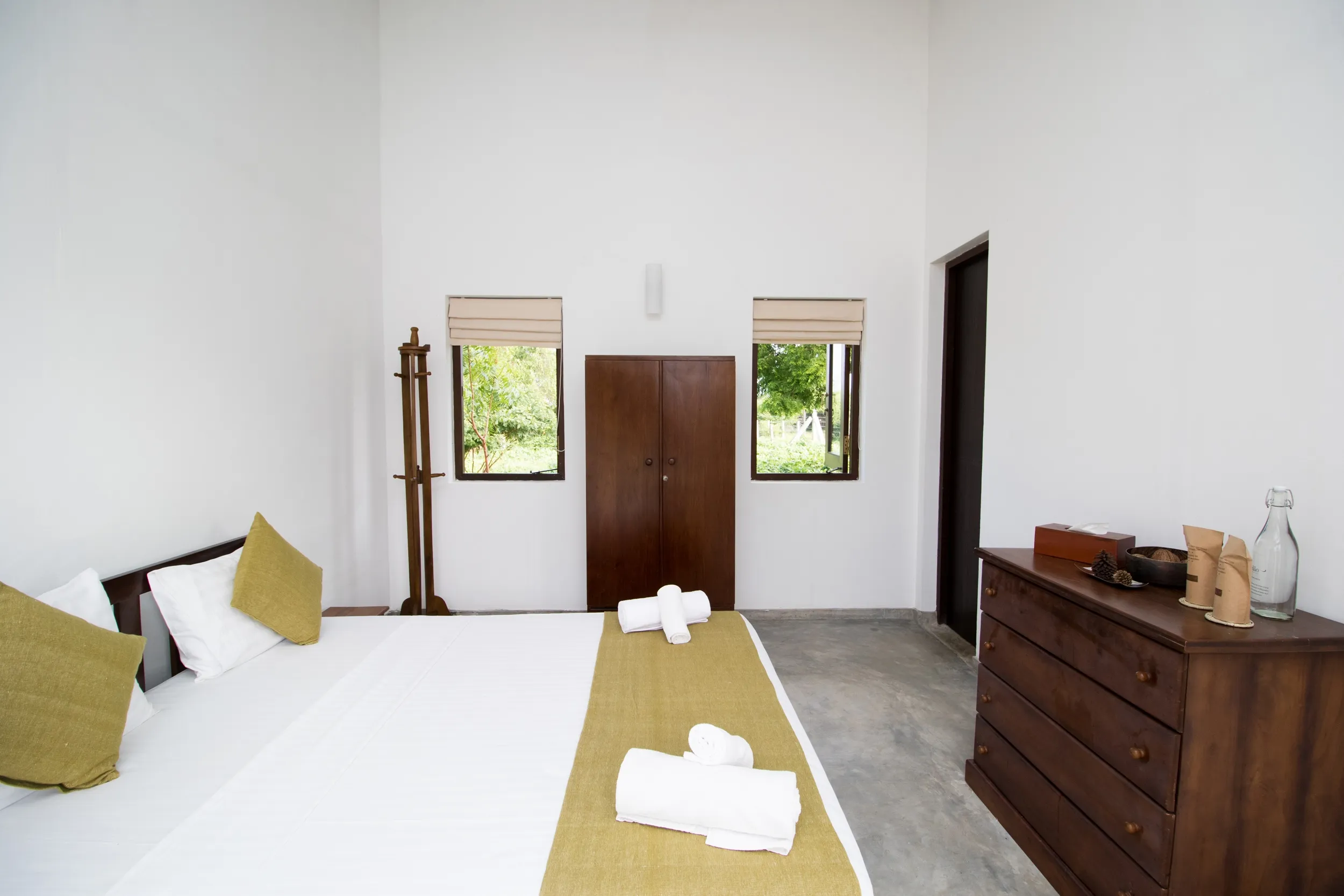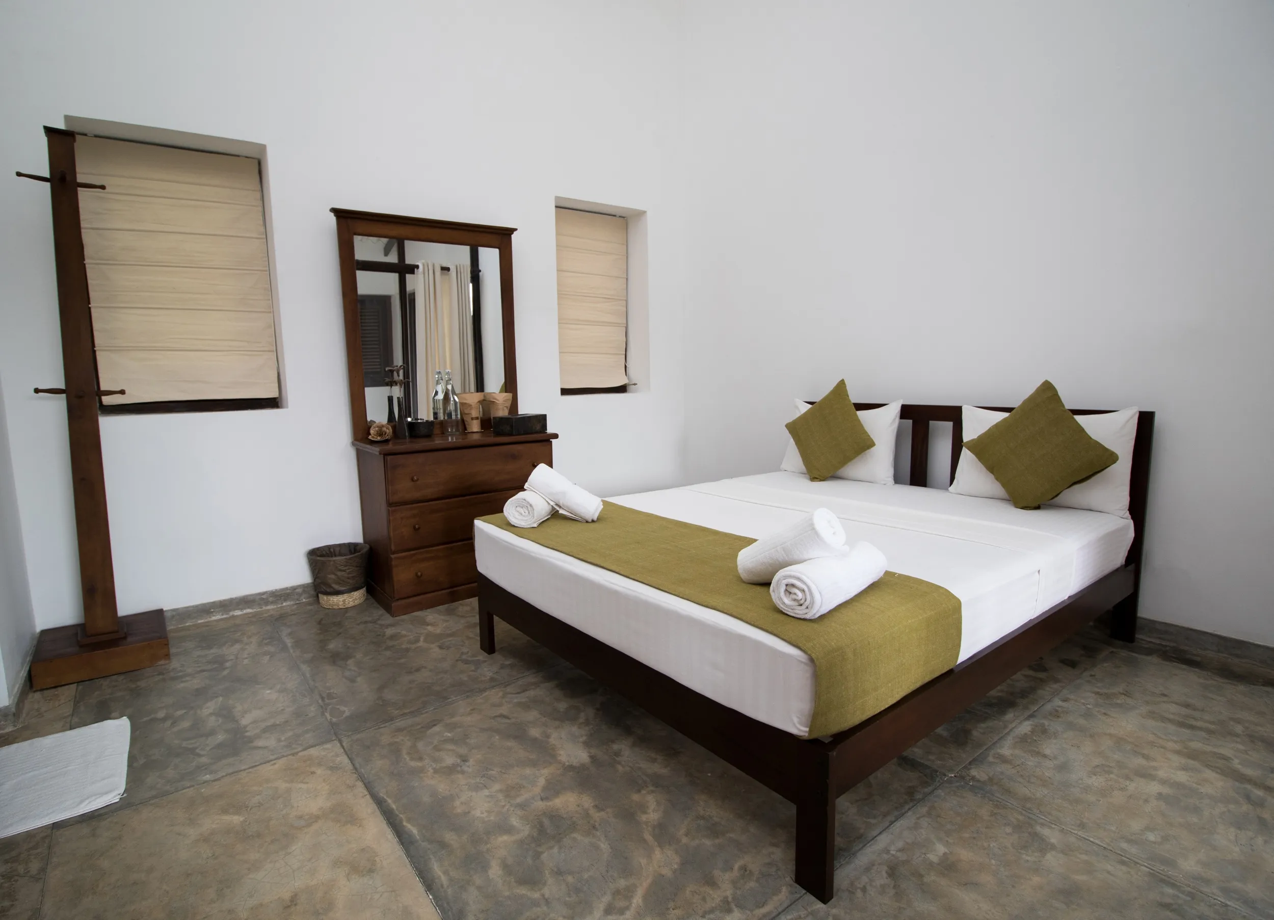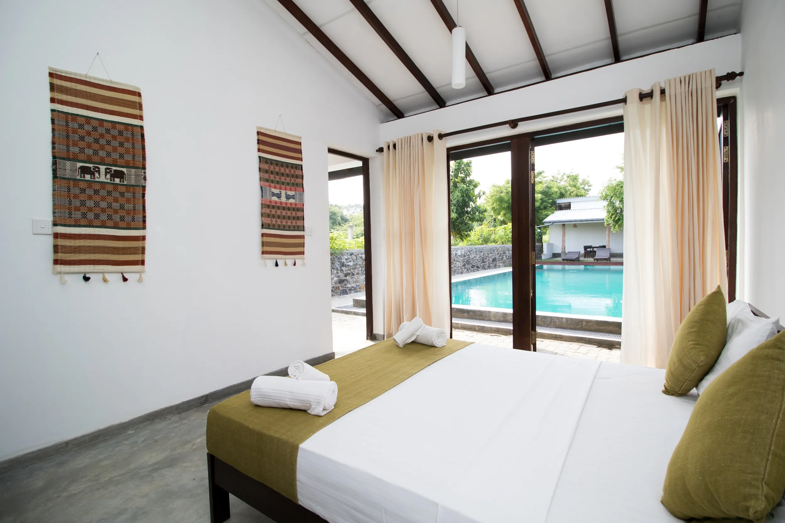 So open that closing your eyes will make you believe you’re in the middle of the jungle. Bird songs by day and the rustle of leaves as elephant forages by night and always, the strong thirsty winds of this dry zone pass gently through. Makes the veranda idyllic for pitching extra beds to sleep the deep nights in. Three simply furnished comfortable bedrooms with en suite bathrooms promising dreamful sleep only disturbed by peacock calls.