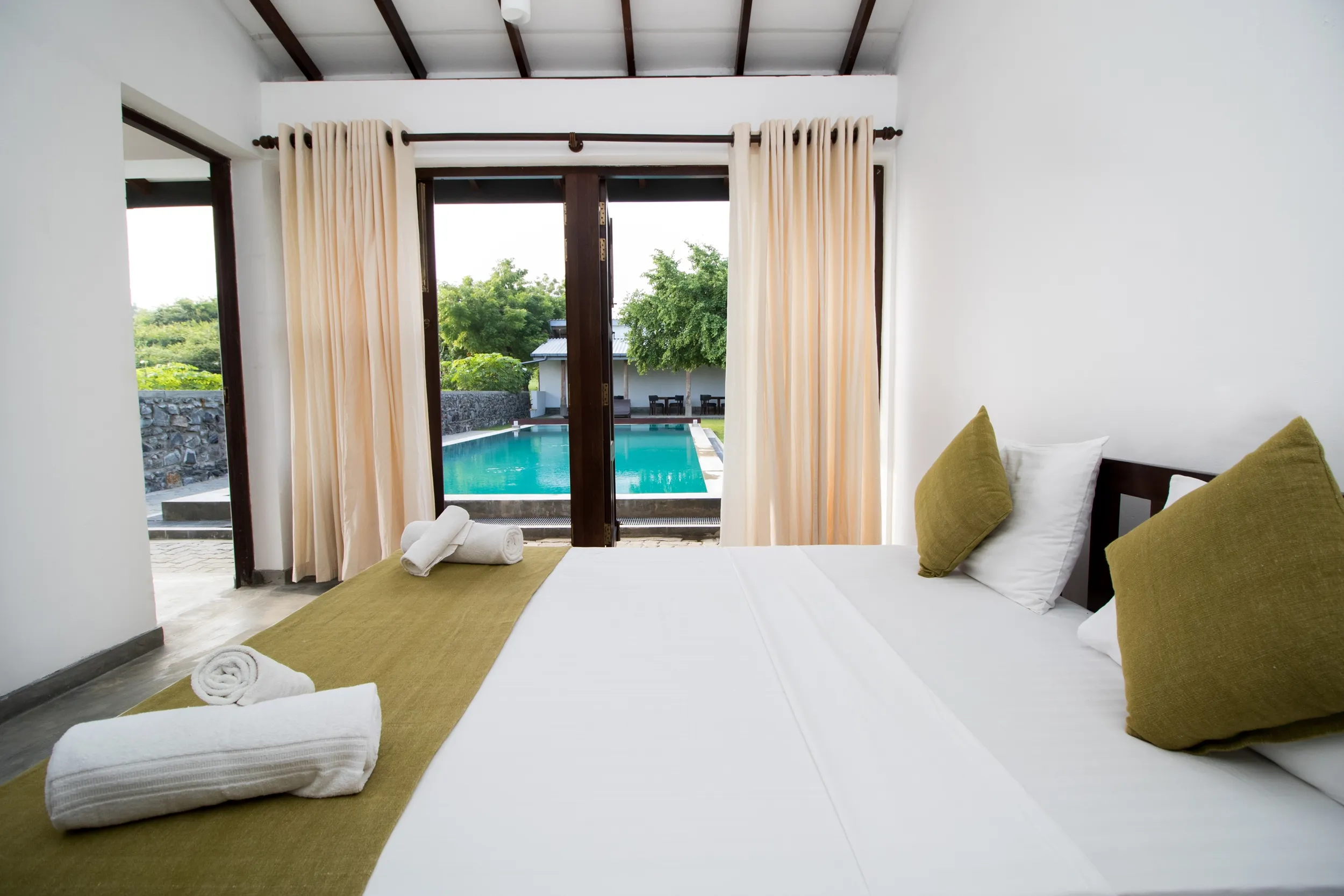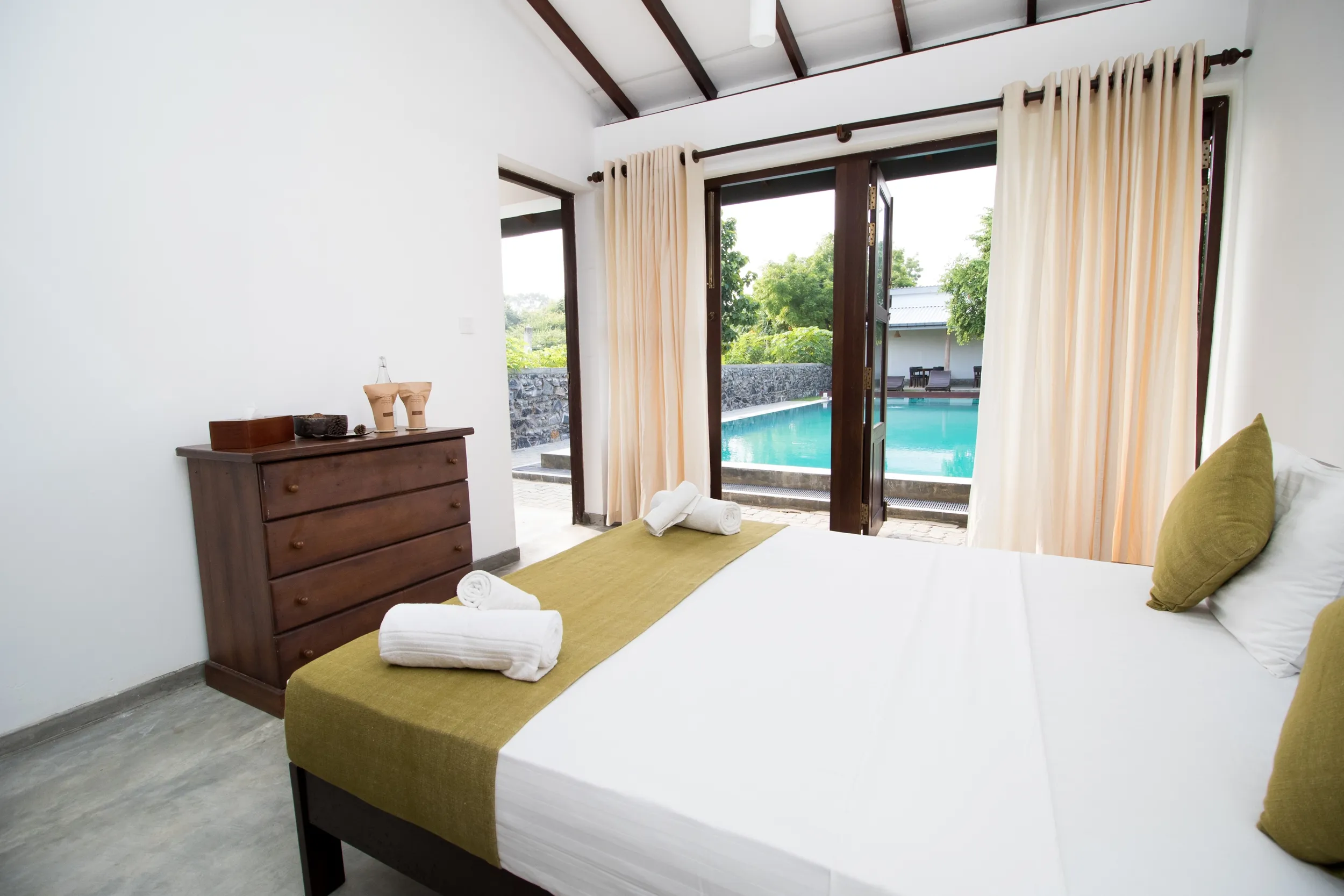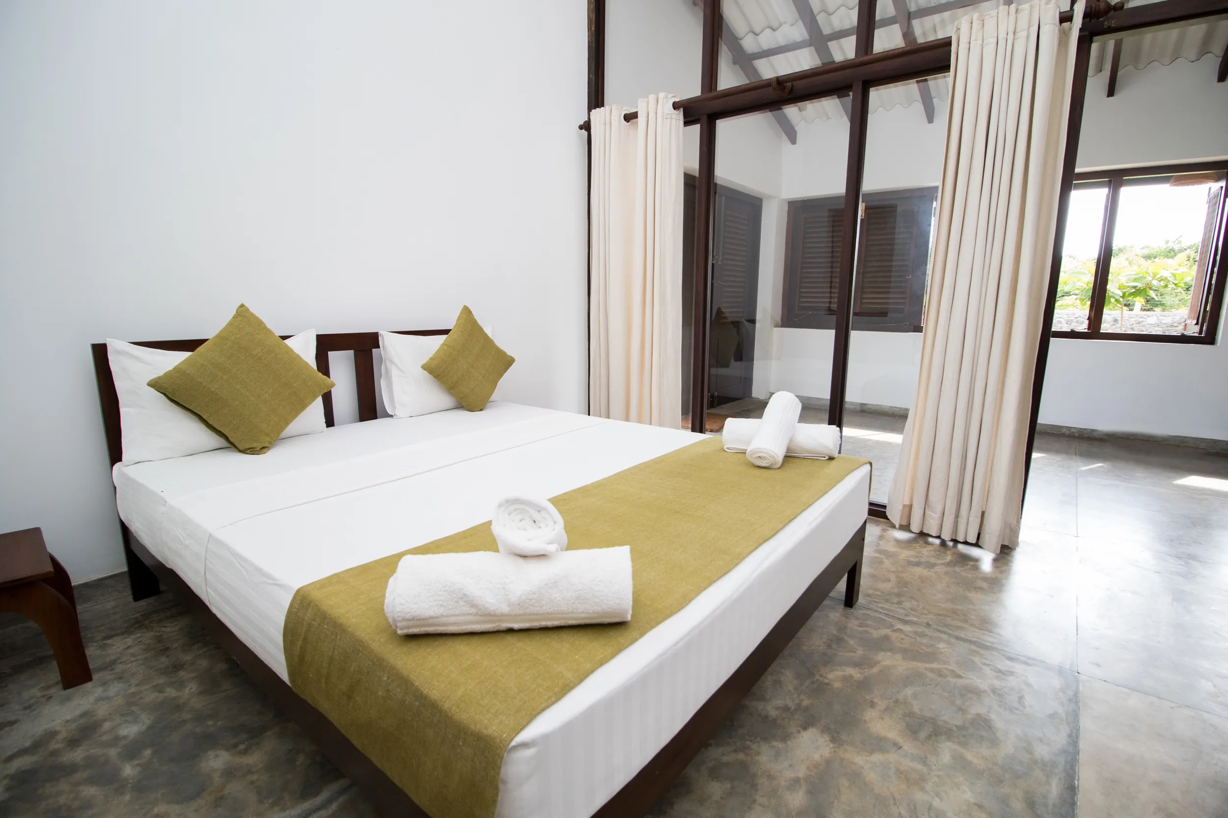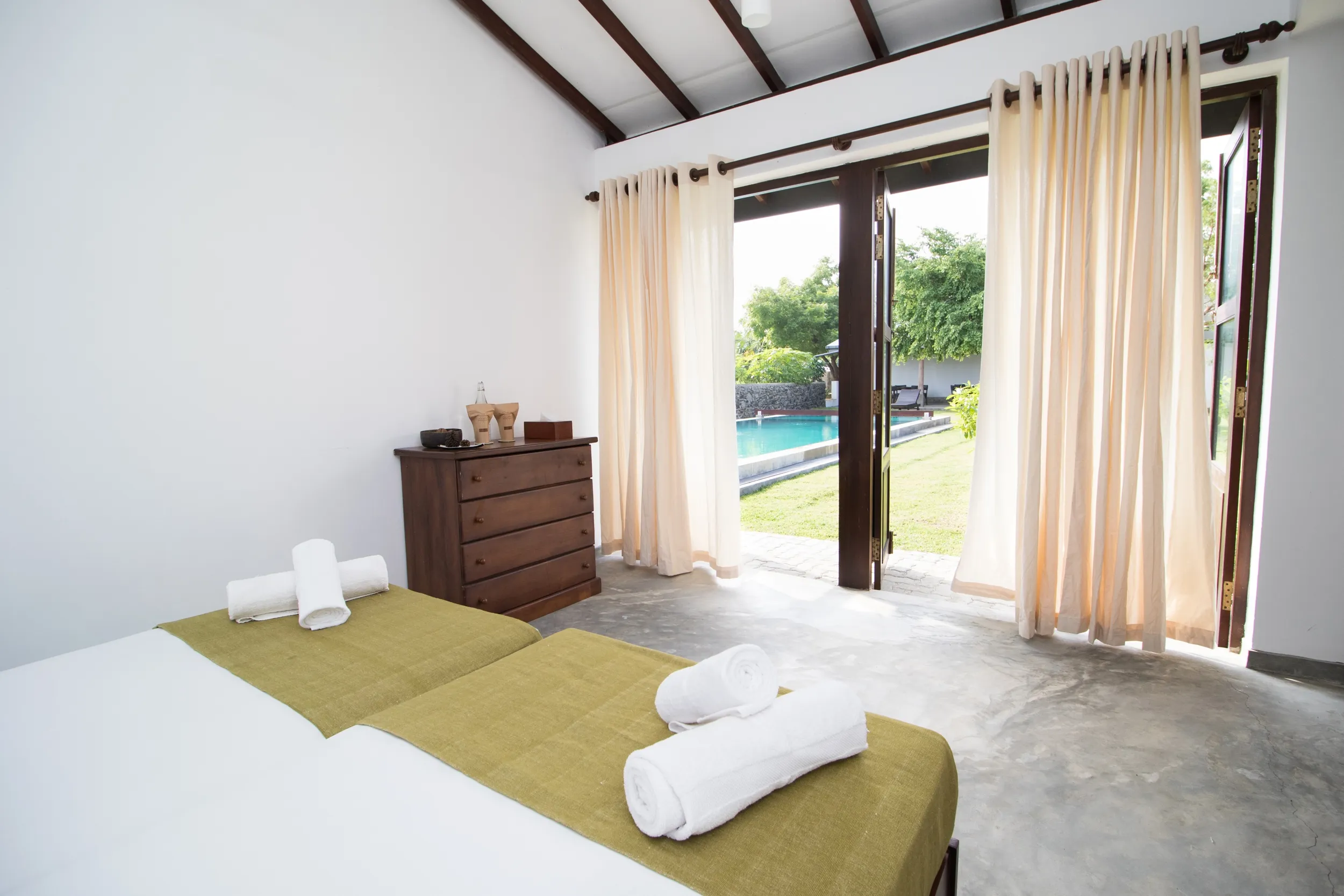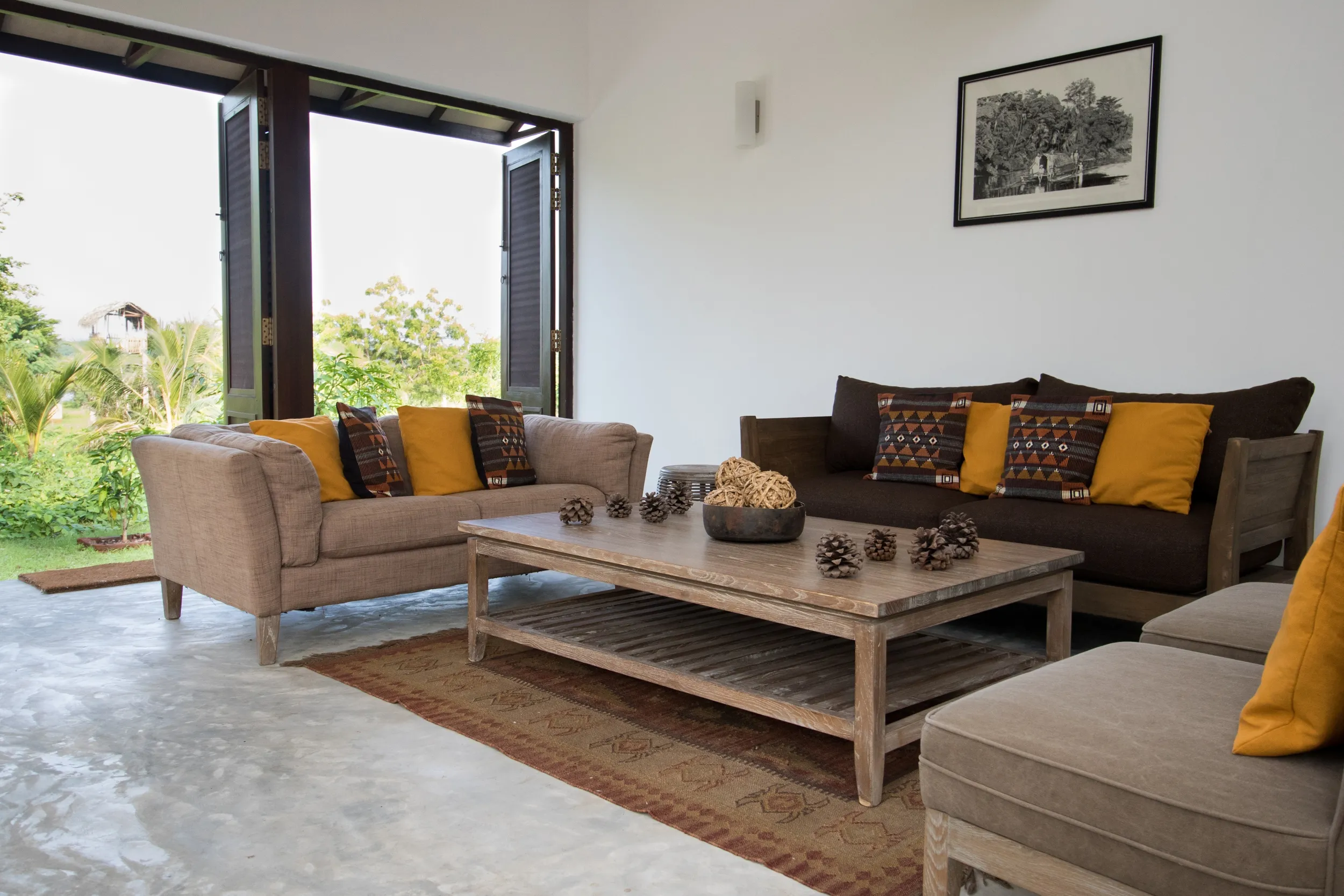 So open that closing your eyes will make you believe you’re in the middle of the jungle. Bird songs by day and the rustle of leaves as elephant forages by night and always, the strong thirsty winds of this dry zone pass gently through. Makes the veranda idyllic for pitching extra beds to sleep the deep nights in. Three simply furnished comfortable bedrooms with en suite bathrooms promising dreamful sleep only disturbed by peacock calls.