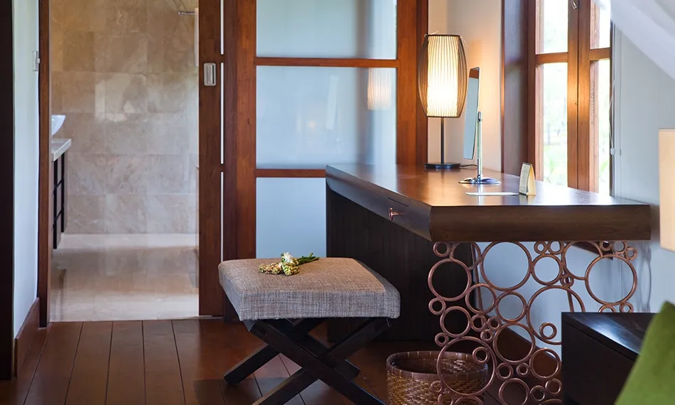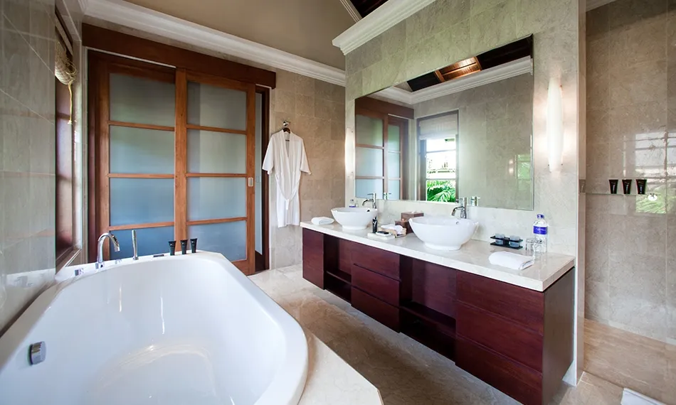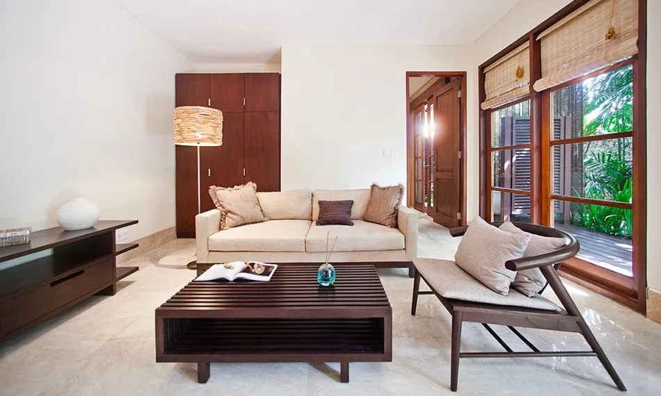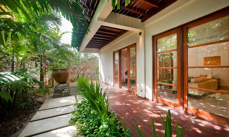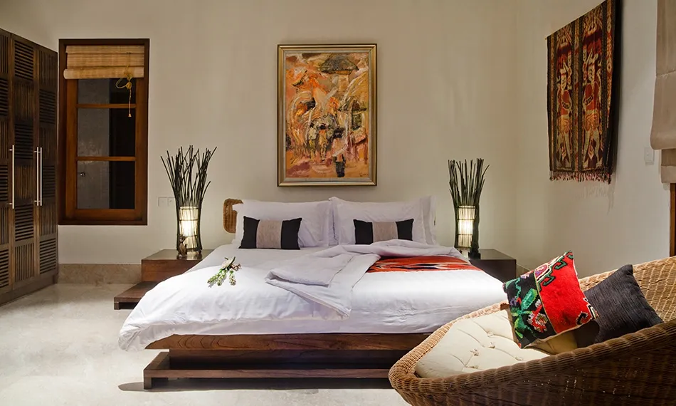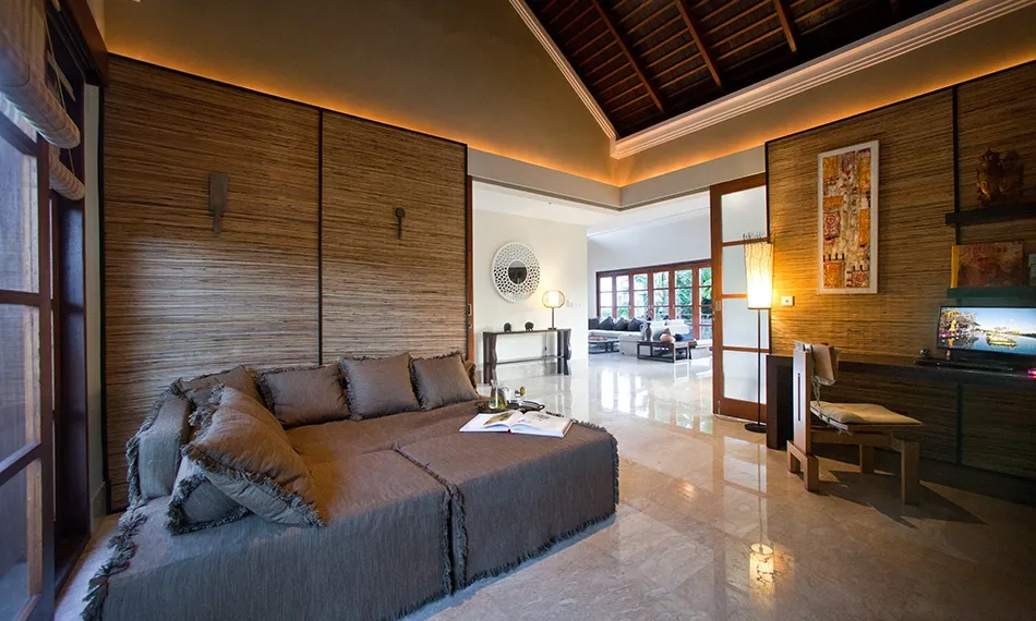 The third spacious bedroom is accessed via enclosed staircase that leads down from the living room and it also has a completely separate entrance from the resort premises, which makes it a good choice for guests who like late nights out. This bedroom is equipped with a four-poster queen sized bed, a sofa with coffee table and an en-suite bathroom with an open-air shower and a bathtub. Sliding doors look into a tiny garden with tropical flowers.