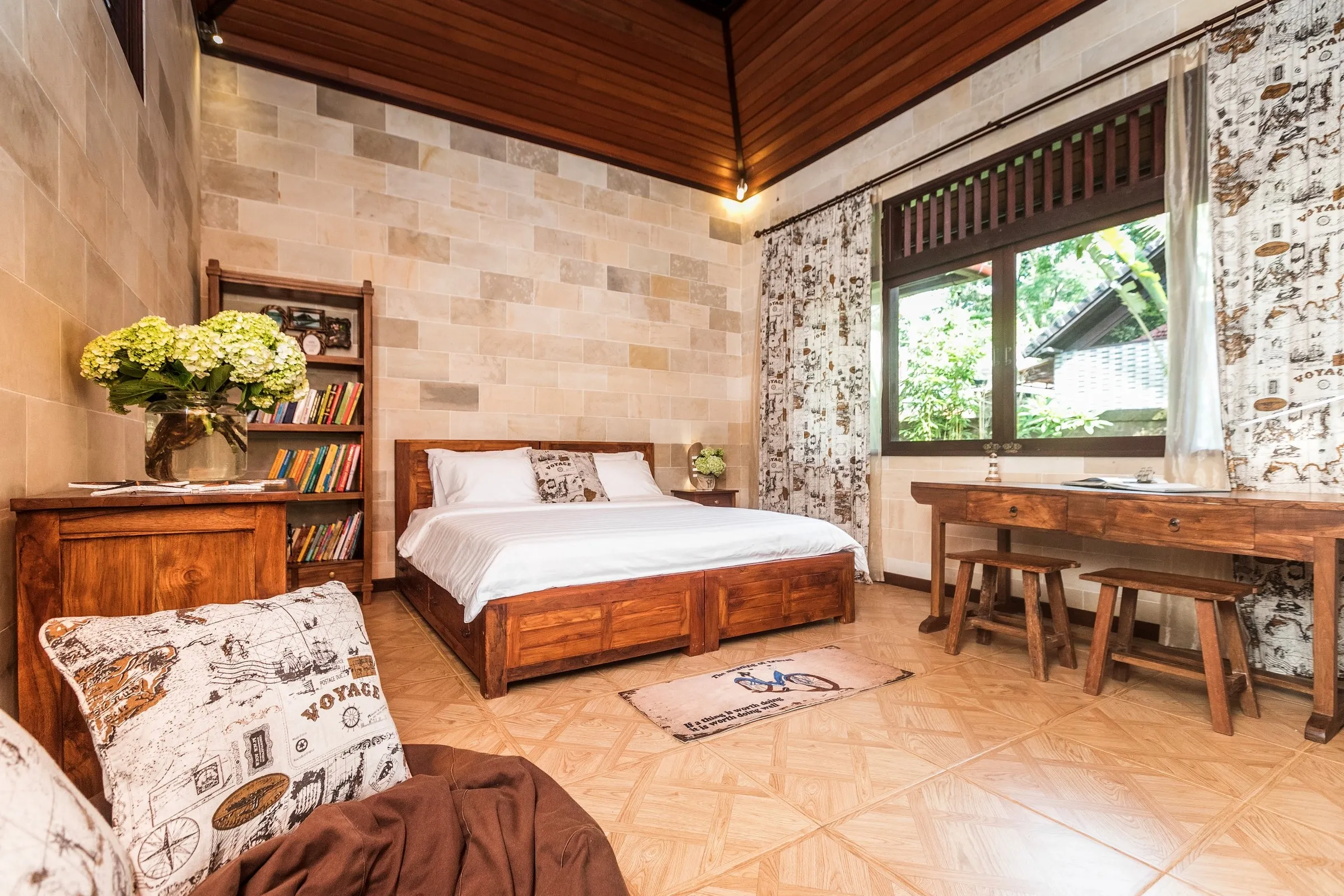 Open living and dining areas are facing the view of natural jungle with private garden and the 8 meter long infinity swimming pool. The villa is specially designed with high ceiling to ensure constant cool air flow throughout the area. There are also high ceiling fans, circle sofa, plenty of pillows, beanbags, TV and sound system. Whole open area is equipped with water drainage and bamboo roller blinds to minimize water coming in during wet season, so there is nothing to worry about during the rainy weather. There is also a shared bathroom with double sink and mirrors, open style shower, mini garden for you to enjoy long shower while admiring of nature.